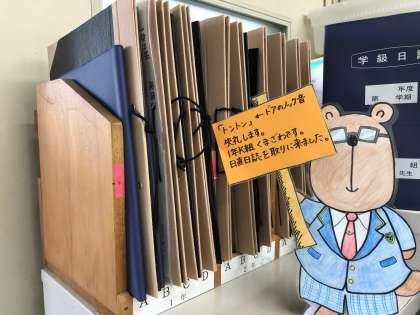 せんせい:「あら。くまざわくん、こんにちは。職員室への入室の仕方がバッチリだね。あれあれくまざわくん。今日はマスクはどうしたの?」