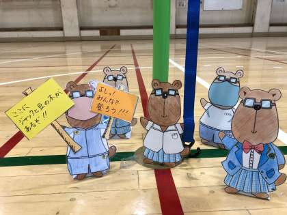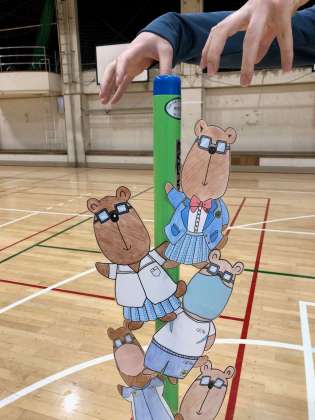 体育館の真ん中にバドミントンの新品の支柱が立てられていました。