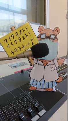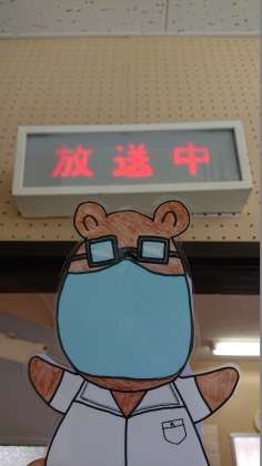 今日のくまざわくんは、職員室の横にある放送室にやってきました。どことなく薄暗い部屋です。しかし、大切な機材があるため直射日光を避けなければいけないので、少し暗めになっています。毎日、給食の時間に楽しい放送が流れるそうです。くまざわくんも挑戦してみました。