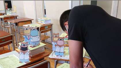 「センパイやさしいなぁ。きちんと手のアルコール消毒してる。すごい!ぼくもやるぞ!」