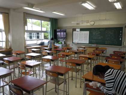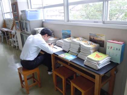 分散登校の終わった教室では、先生方が使った机とイスをていねいに消毒してくれています。また、回収されたたくさんの課題は一つ一つ丁寧に点検されています。一人一人の生徒の顔を思い浮かべながら様々な作業を地道に行っている先生方のおかげで、臨時休校中でも学校が成り立っています。(桝田)