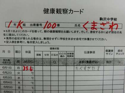 くまざわくんの今日の健康観察カードをのぞいてみましょう。体温OK!健康状態もOK!たべすぎた!! くまざわくん大丈夫かな・・・。心配です。
