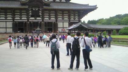奈良公園、東大寺の南大門出発しました。ほぼ予定通りです。バスに乗る5分前に雨が降り始めました。とてもラッキーな天気変化で助かりました。生徒は、やはり大仏の大きさにビックリしていました。京都に向かっています。一時間ちょっとかかります。