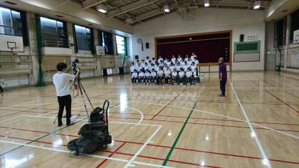 本来ならば中庭での撮影でしたが、あいにくの雨でしたので体育館で行われました。(袴田)