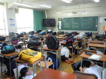 生徒はみんな真剣です。すぐさま机の下に入り、身を守ることができました。
