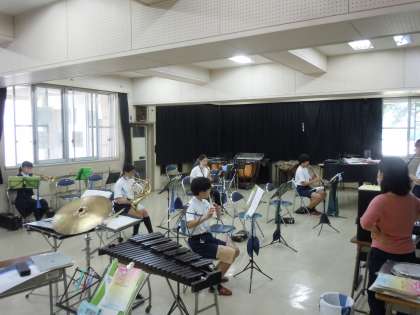 吹奏楽部もソーシャルディスタンスを守りながら音を合わせています。