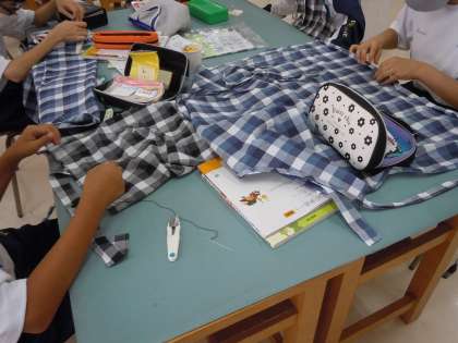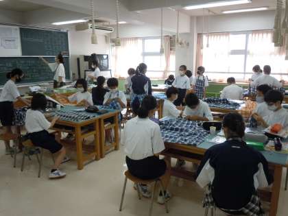 家庭科では被服室でエプロン作りです。針と糸を器用に操り、アイロンがけまでていねいに作業を進めていました。できあがりが楽しみです。(桝田)