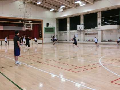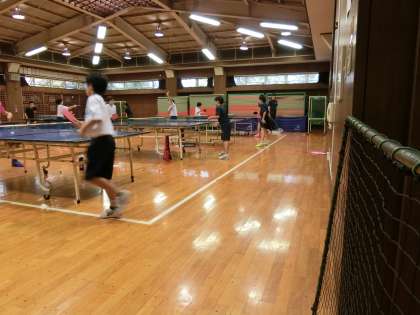 卓球部は、1年生が先輩と試合をしています。センパイのするどいサーブに1年生も一生懸命返そうとしています。