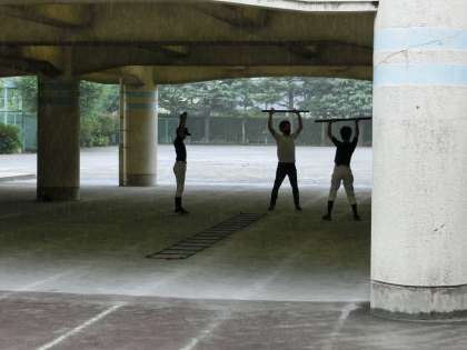 野球部は、おもりを使って筋トレです。音楽を流して、リズムに合わせてやっています。