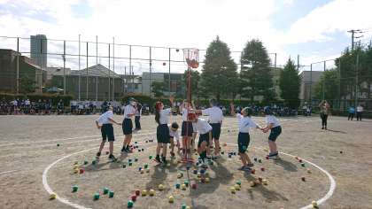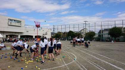 今年の新種目、玉入れです。意外にコントロールがむずかしいですね。(桝田)
