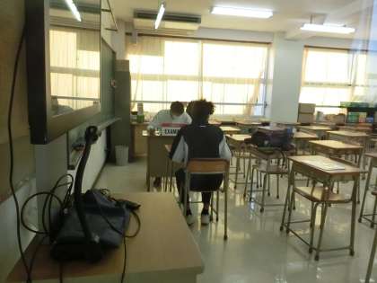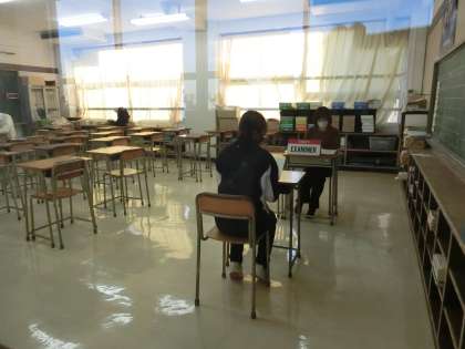 「教室の中に入らないほうがいいね。みんながんばっているね。」