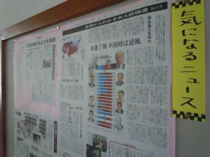 図書館司書の方が新聞を活用して掲示板を飾ってくれています。生徒の皆さんが興味をもちそうな話題や最近のニュースを取り上げながら、関連する図書室の蔵書が紹介されています。読書の秋、図書室での新たな本との出会いを楽しみましょう。(桝田)