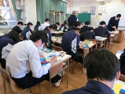 3年B組は美術です。自身の「目」を書き心の中を表現した肖像画を書いています。
