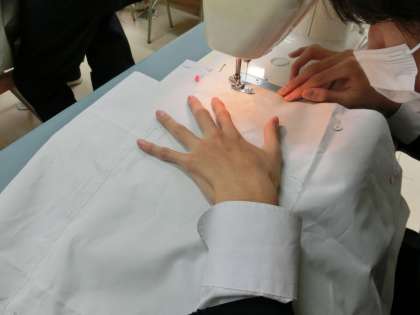 被服室では、3年生が「非常持ち出しバッグ」を作っています。
