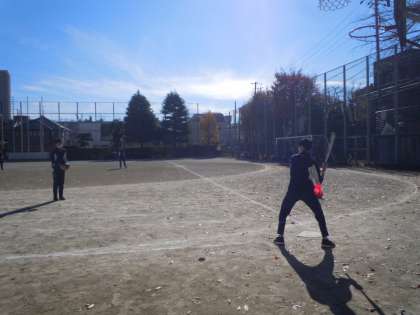 体育の授業です。外は本当に良い天気。男子はソフトボールの試合が白熱しています。出るかホームラン!