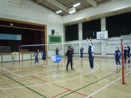 体育館では女子がバレーボールをしています。空中でのボールキャッチを通してスパイクの基本動作を反復しています。決まるかナイスアタック!(桝田)
