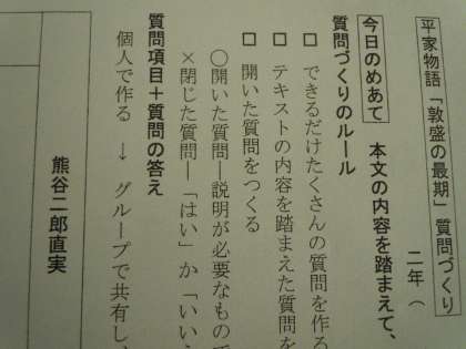 今日の目標は、「直実と敦盛への質問をつくろう」です。