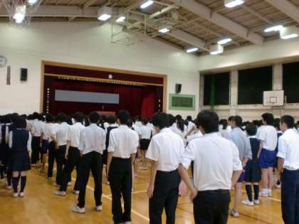 今学期最後の全校朝礼です。校長から夏休みには、日頃の生活と違う中で、様々な刺激を受け、学期中に培ったいろいろな資質を一層成長させてください。また、節電への取り組みと熱中症予防について話がありました。その後、運動部の夏季大会の表彰があり、女子バレーボール部の世田谷南地区大会優勝、第2ブロック大会2位。剣道部区大会団体3位。女子バドミントン部予選大会団体3位、シングルス2位、3位。卓球部シングルス5位の表彰をしました。バレーボール部男子と女子、剣道部、卓球部は都大会に出場することになっています。今日は朝から気温が高いですが、暑さ対策で始めた体育着着用可を利用して体育着で朝会に参加した生徒は、三年生で約40%、二年生で約30%、一年生で20%位でした。