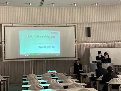 駒中からは生徒会長と2年副会長が参加し、「牛乳パックリサイクルの取組」(今後実施予定)について話しました。
