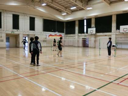体育館では、バドミントン部が練習をしています。卒業生が数人来てくれました。