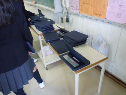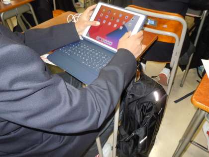 準備に時間がかかり遅くなってしまいましたが、本日ようやく1年生にタブレット端末で配布しました。これから学習活動で活用します。使用上のルールをよく理解して、適切で効果的な使い方を身に付けましょう。3年間大切に使ってください。(桝田)