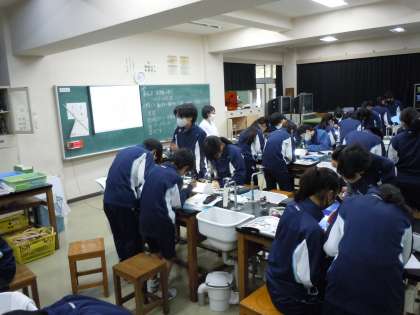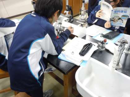 2年生の理科です。「生物のからだのつくりと働き」の単元に入っています。最初に、顕微鏡の使い方の基本を確認しています。今後の観察にとって欠かせない技能です。しっかり使い方をマスターできましたね。(桝田)