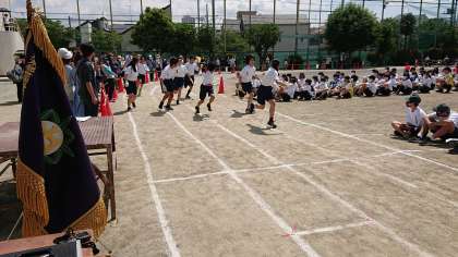 最初の競技は、各学年ごとの全員リレーです。熱戦です。(桝田)