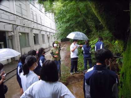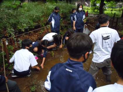 定期考査が終わり、JRC部による作業が行われました。突然の豪雨のため作業ができるか心配されましたが、何とか作業ができる程度に雨が止みました。生き物についてのレクチャーを受けた後、水草を移植したり、土を盛り直したりしてビオトープがきれいに整いました。明日の朝が楽しみです。(桝田)