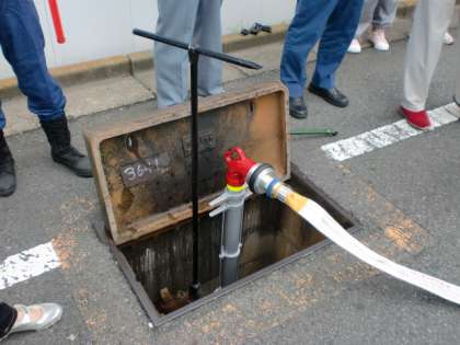 消防関係者の間で現在普及に力を入れているのが、「スタンドパイプ」です。道路の消火栓に直接消防ホースを接続し、ポンプを使わずに水道の圧力で放水するものです。大災害になると、消防車がすぐに来ることができないことが予想されています。町会の防災倉庫に保管しておき、今回のような訓練をしておけば、消防団員でなくとも放水が可能で、消火にかなりの効果が期待できるそうです。気をつけてみると、道路面には黄色い線で囲った消火栓が、たくさん設置されているのを発見できると思います。