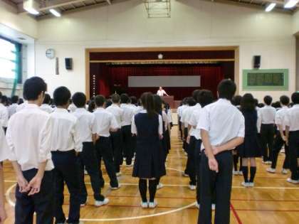 35日間の夏休みも終わり、今日は二学期の始業式です。生徒は一回り大きくなって、元気に登校してきました。転入生が1年に女子、2年に男子が1名ずつあって、全校生徒352名となりました。校長は、4ヶ月間の長い学期になりますが、行事も多くあり、充実した学期にしたいと生徒に話しました。