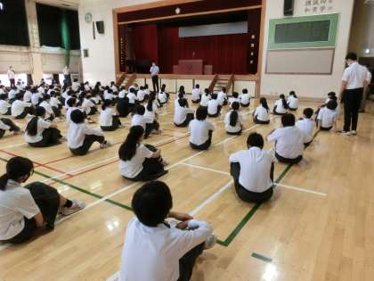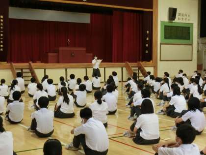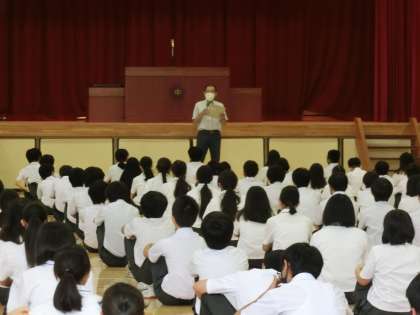 校長先生のお話です。生徒の皆さんはよく聞いています。