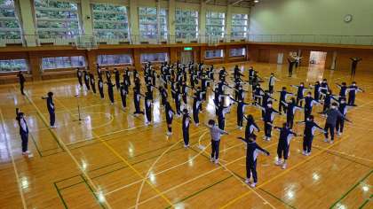 おはようございます。明け方は雨模様でしたが、予報通り晴れてきました。オリエンテーリングには絶好の天気です。朝礼は体育館で行いました。(桝田)