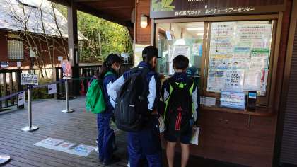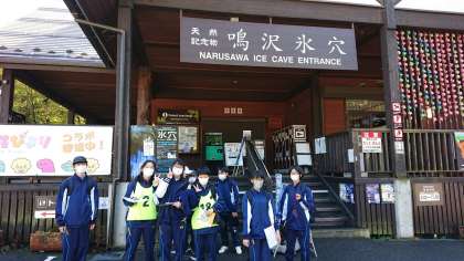 鳴沢氷穴では、洞窟の中で天然の氷を見ることができます。無事にここまでたどり着けたようです。富士山は山頂まではっきり見えています。(桝田)