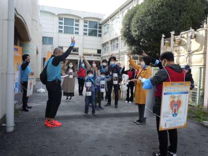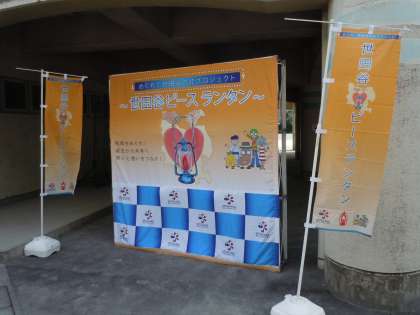 当初は昨年6月に実施する予定でしたが、ようやく実現しました。このイベントはオール世田谷による「共生のまち世田谷の実現」にむけた取り組みで、世田谷区内をランタンにともされた「世田谷の灯」がリレー形式の行進でつながれていきます。「世田谷の灯」とは、世田谷公園内にある「平和の灯」と宮城県三陸町で採火された「復興の灯」が合火されたものです。世田谷公園の「平和の灯」も、広島市の「平和の灯」と長崎市の「誓いの灯」が合火されたものですから、3つの大切な火が合火されているということです。本日は、駒沢中が中継地点となり、次の中継地点の弦巻小までつながれていきました。ピースランタンなので、「ピース」を出発の合図にして行進が始まりました。この灯にこめられた願いをしっかり受け止めていきたいと思います。(桝田)