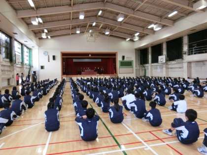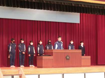 生徒会任命式に引き続き、後期最初の生徒会朝礼が行われました。10月28日(木)に行われた、後期第1回専門委員会において決められた、年度末までの5ヶ月間の活動方針が報告されました。それぞれ前期からの継続の部分と何に力を入れていくのかが語られ、