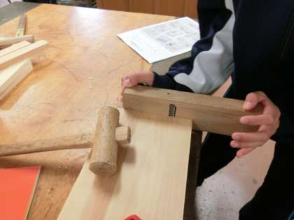 4時間目の技術室では、1年生の授業が行われていました。木材で棚などを作っています。
