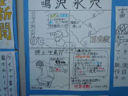 先月に行われた移動教室について、行動班ごとにまとめの新聞作成を行っていました。この度作品が完成して、廊下に掲示してあります。力作揃いで見応えがありますね。保護者の皆さま、三者面談でご来校された際にぜひご覧ください。(桝田)