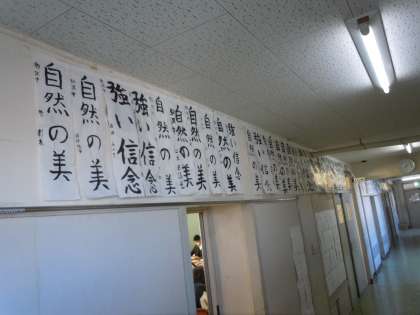 毎年1月恒例の書き初め展です。1年生は「宇宙の旅」「青雲大志」、2年生は「自然の美」「強い信念」、3年生は「温故知新」「躍動する心」を書きました。日本の伝統文化を継承する大切な取り組みですね。どれも力作揃いです。この作品から8作品を「区展」に出品します。(桝田)