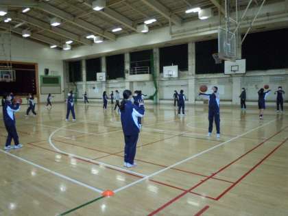 女子はバスケットボールに取り組んでいます。本日はドリブル・シュート・パスといった基本技術の習得をめざしています。身に付けた技術を発揮して、充実したゲームをやりましょう。(桝田)
