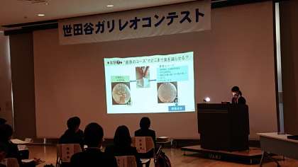 新たにオープンした教育センターで第12回ガリレオコンテストが行われました。駒沢中から2年生女子が最終審査に残り、本日発表しました。研究テーマは「マスクを安全に取り扱うには?」です。2年間かけて同じテーマを探究して、時間をかけた実証実験を積み重ねました。その成果が実り、最優秀賞にあたるガリレオ賞を受賞しました!おめでとうございます。