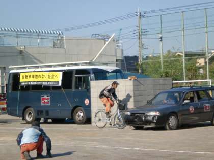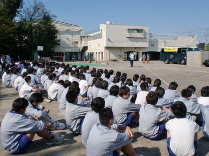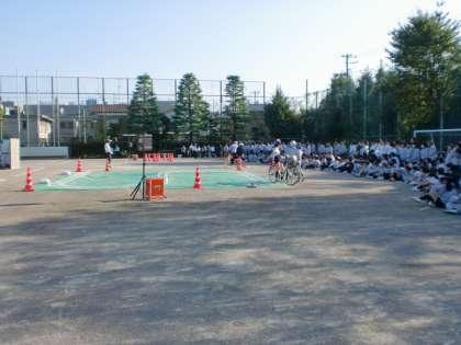 本日午後、セーフティー教室として「自転車安全教室」を実施しました。世田谷警察署交通課の方による、自転車安全五則と事故の賠償の大変さなどのお話の後、スタントチーム「スーパードライバーズ」による事故再現(このような講習手法を「スケアード ストレート」と言うそうです)により、自転車事故の怖さとどのようなときに起こりやすいかを体験的に学びました。さらに、代表生徒による傘さしによる片手運転や二人乗りなどの危険な乗り方がいかに危ないかの実習を行いました。生徒は熱心に参加していましたので、きっと安全な自転車の乗り方をしようと考える機会になったことと思います。企画設定してくださった世田谷区交通政策担当部交通安全自転車課の皆様、ありがとうございました。