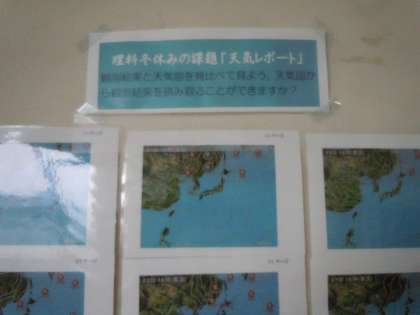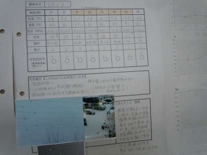 2年生の理科では「天気レポート」に取り組みました。1月6日には雪がかなり積もったので、その日を観測したレポートが多く見られました。中には新潟県のレポートあり、雪の多さに驚かされました。この結果を天気図と関連づけられるようになりましょう。(桝田)