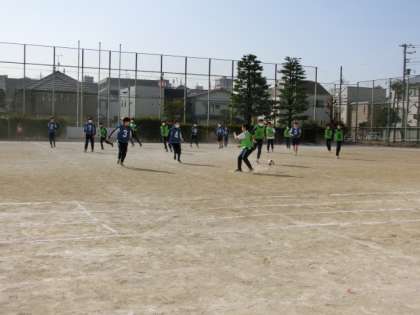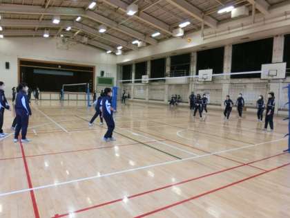 1時間目は、男子はサッカー、女子はバレーボールをやっています。
