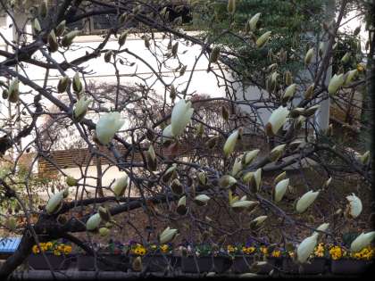 中庭の白梅と白木蓮が咲き始めました。日中は春を感じる陽気です。修学旅行も穏やかな日々となりそうです。(桝田)