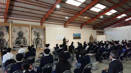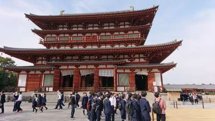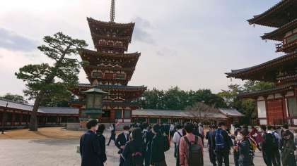 薬師寺です。最初に薬師寺僧侶からの法話を聴いて、薬師寺や仏教のことを学びます。見学では、白鳳時代を代表する薬師三尊像の美しさや金堂・三重塔の建築美を堪能しました。(桝田)