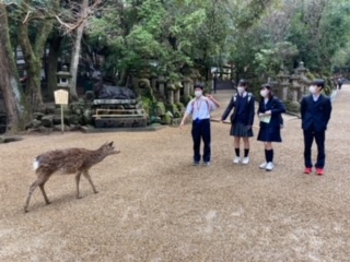 奈良公園の班行動、宿舎から一番遠い「春日大社」です。緩い山道をひたすら登り、ようやく本殿を参拝できます。(岡崎)