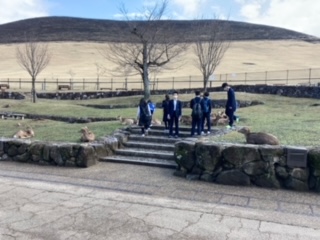 春日大社から二月堂に向かう途中に、「若草山」があります。山焼きで上の部分は真っ黒です。(岡崎)