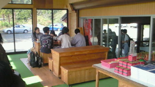 1・2年とも、昼食場所は紅葉台下のドライブインです。一番乗りは二年生のグループで一時間半もかからず到着しました。11時50分現在、両学年で10チーム到着しています。ジュースと味噌汁をもらって、お弁当を食べています。