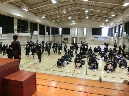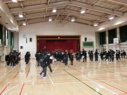 クラス発表の学年だよりを見て、体育館に移動しました。2年生も3年生も体育館での集合が早く、予定の時間より早く整列ができ、着任式始業式を始める準備ができました。(大竹)