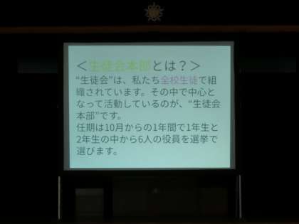 学校生活が、より充実するように動いてくれるのが生徒会・委員会です。1年生は真剣に聞いていました。